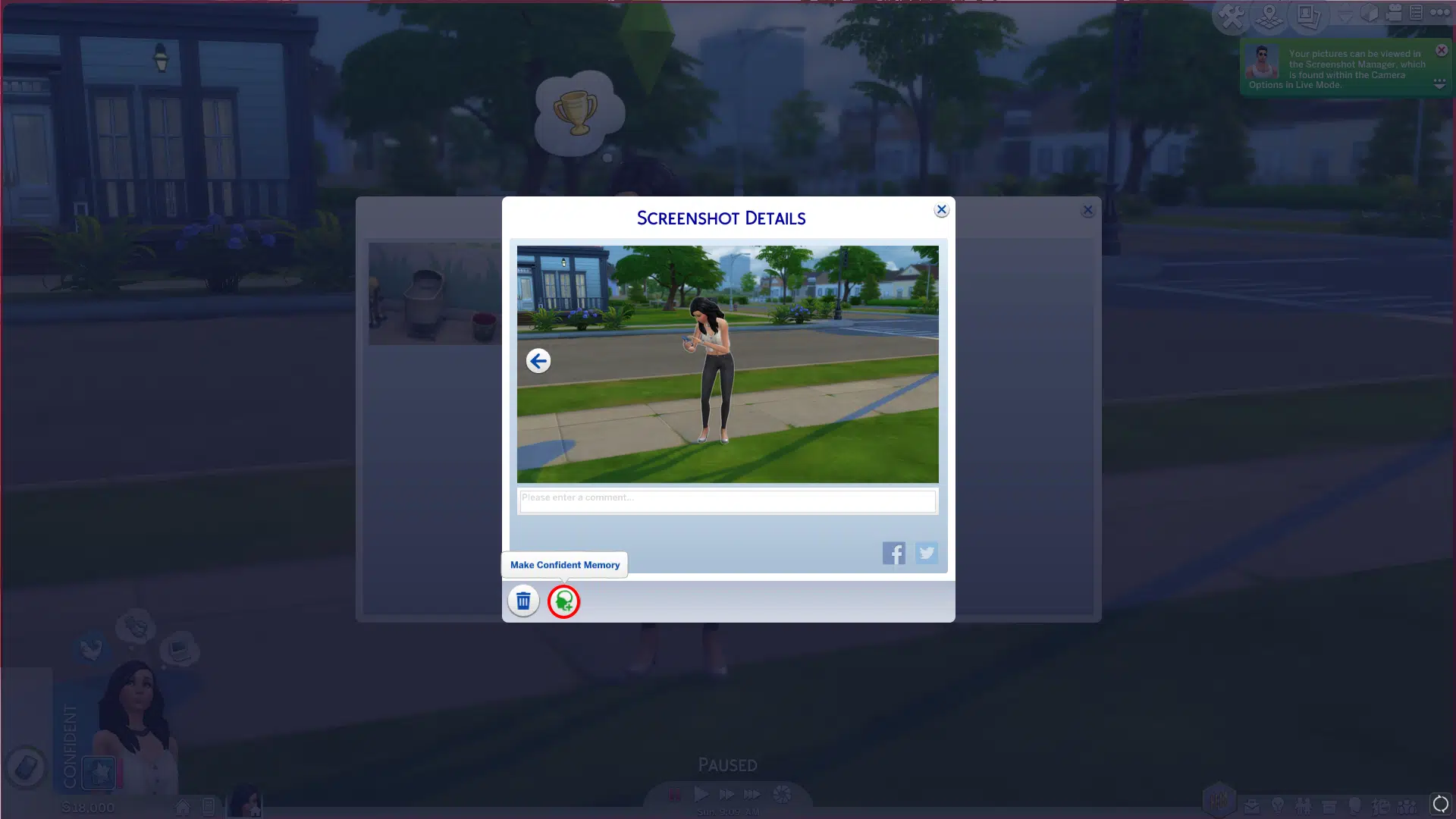 4. When you click this you can then press the button circled below which modifies the screenshot into an emotional memory, this means that it can be remembered and has an affect on any sims involved. This will also tell you what kind of emotion is linked to the memory.