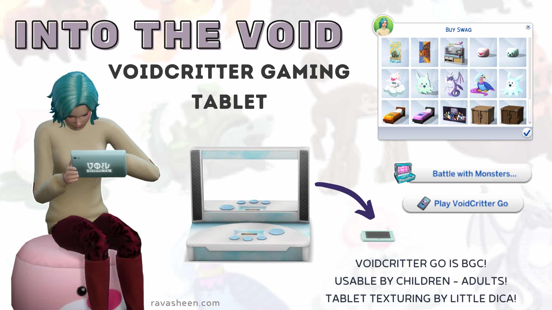 The Into The Void: Voidcritter Gaming Tablet will bring the world of Voidcritters to life in a new way for children and adults alike! It will eliminate the need for the big bulky battle station and allow Sims to take Voidcritters with them wherever they go. In addition to having all the same features as the existing battle station, it will also come with new features that are base game compatible. Players who don’t own Kids Room Stuff will still be able to collect virtual versions of the Voidcritter cards and play with the Voidcritter Go app on the tablet, as well as earn rewards for playing and purchase Voidcritter merchandise! Players who do own Kids Room Stuff will be able to purchase the physical cards and train/battle them with the tablet as well. Online play that increases relationships between Sims will also be a part of the mod.
